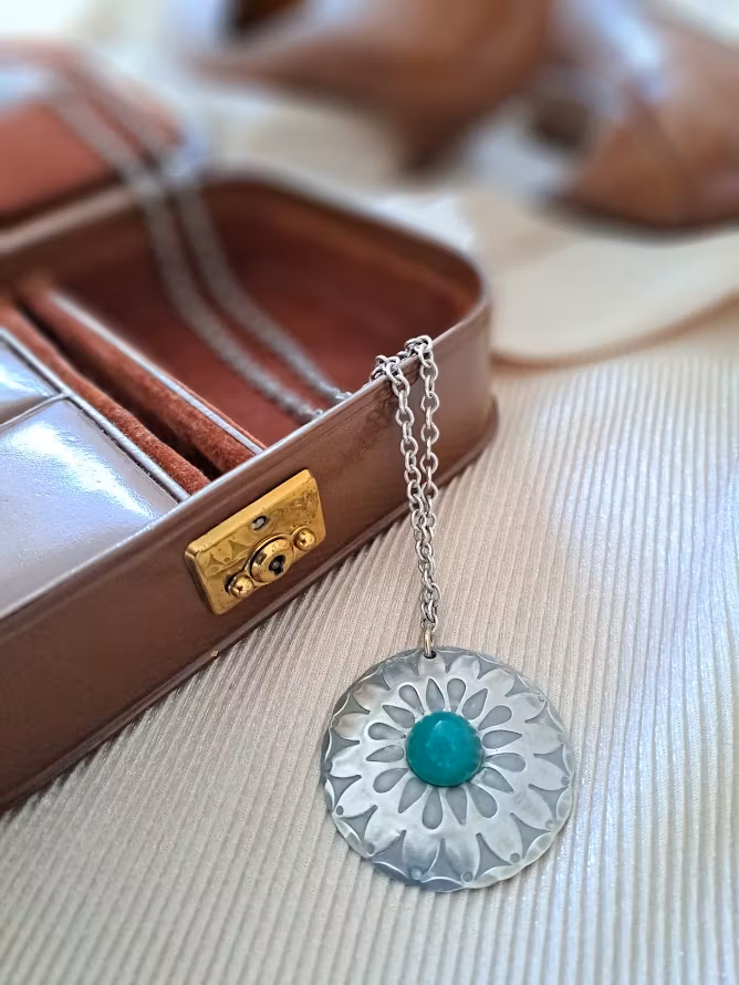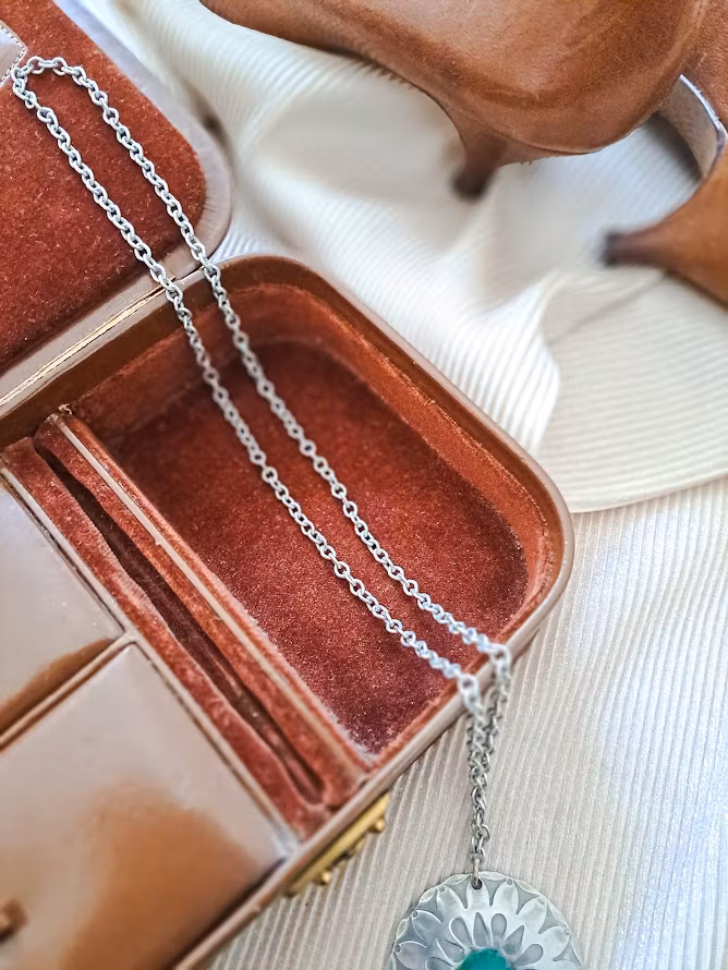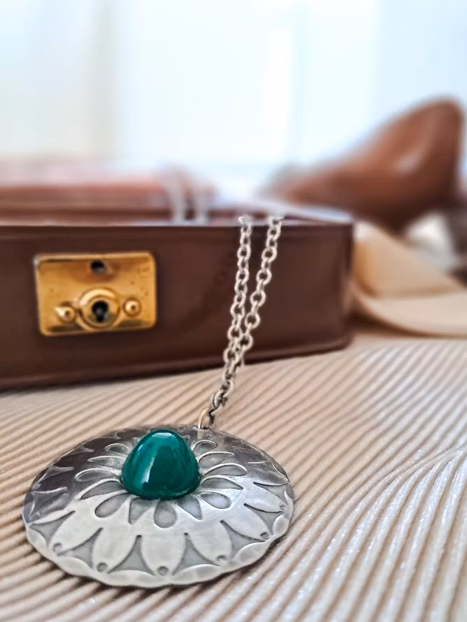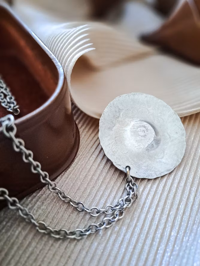 Tennhalsband, Danmark 159 kr Lägg i korgen Dela Information Äldre stilrent tennhalsband med glasstenshänge i grönt. Halsbandet är troligtvis från 1960/70-talet. Märkt Handarbejde, tin, Danmark Mått L ca 37cm