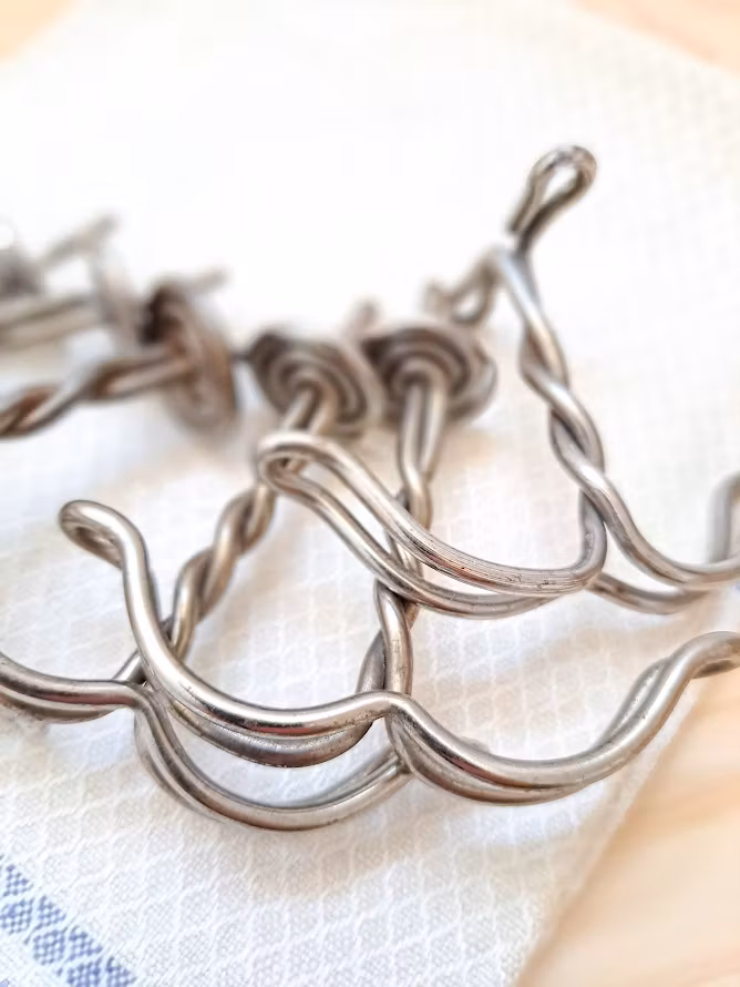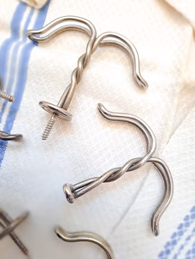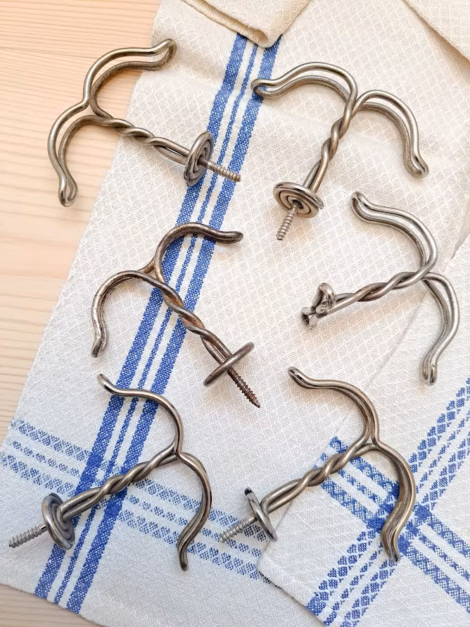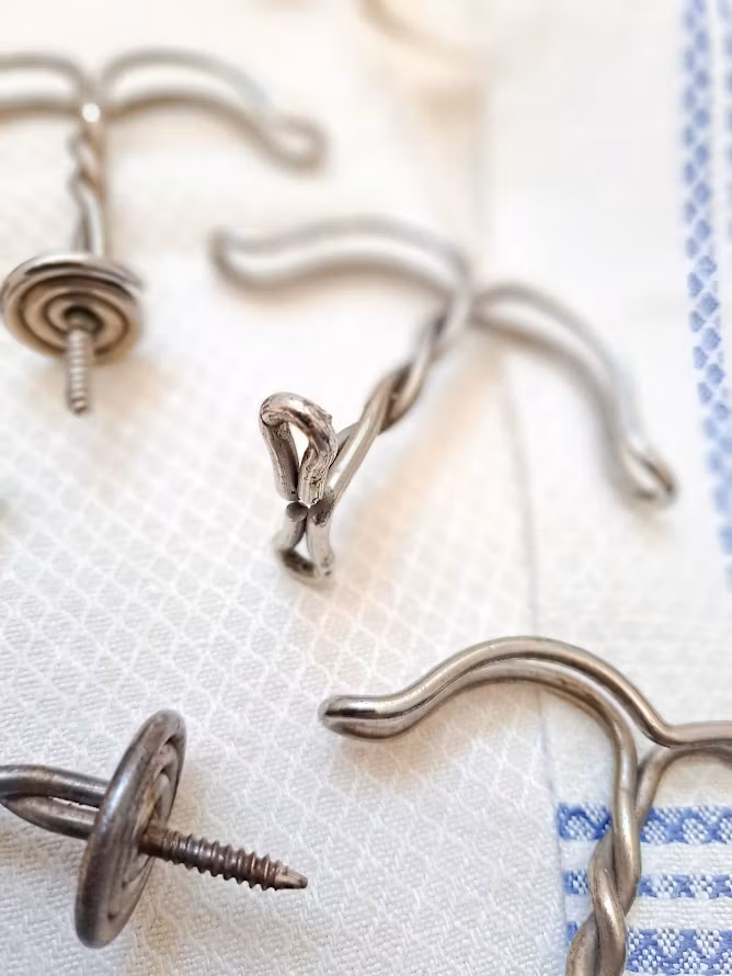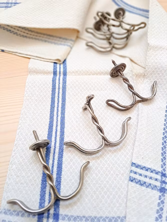 Klassiska äldre ankarkrokar i metall. För montage under exempelvis en hylla. Patina samt fästen kan variera något mellan de olika krokarna (se bilder). Levereras om 6 styck ankarkrokar.