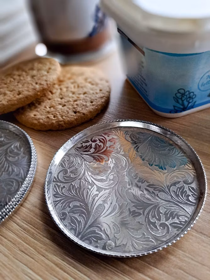 Äldre underlägg för glas eller flaska samlade i en ask. Försilvrade. Fint till festens dukade bord. Levereras om 4 styck glasunderlägg. I väl bevarat bruksskick.