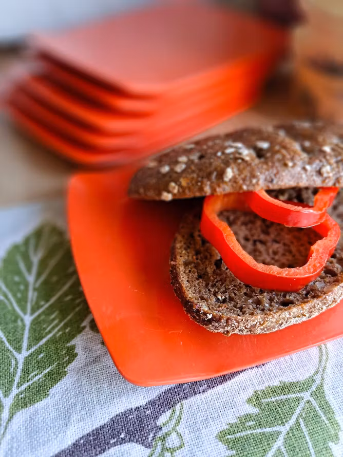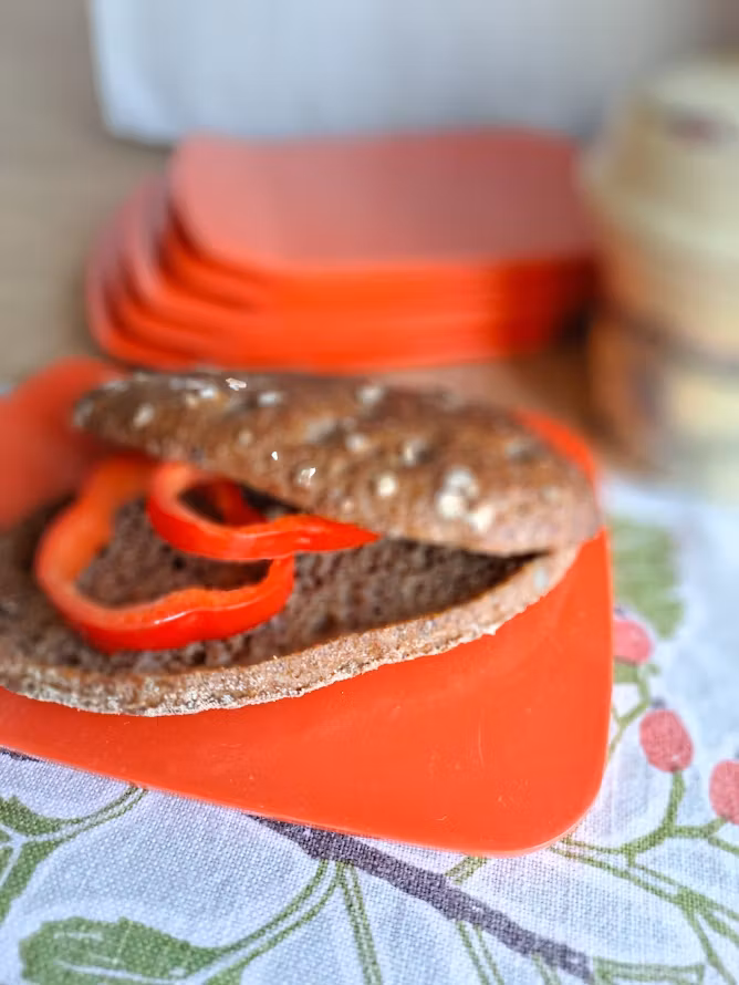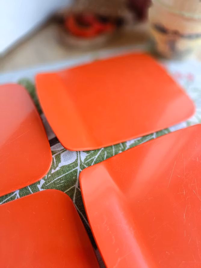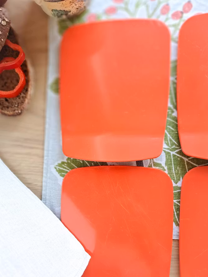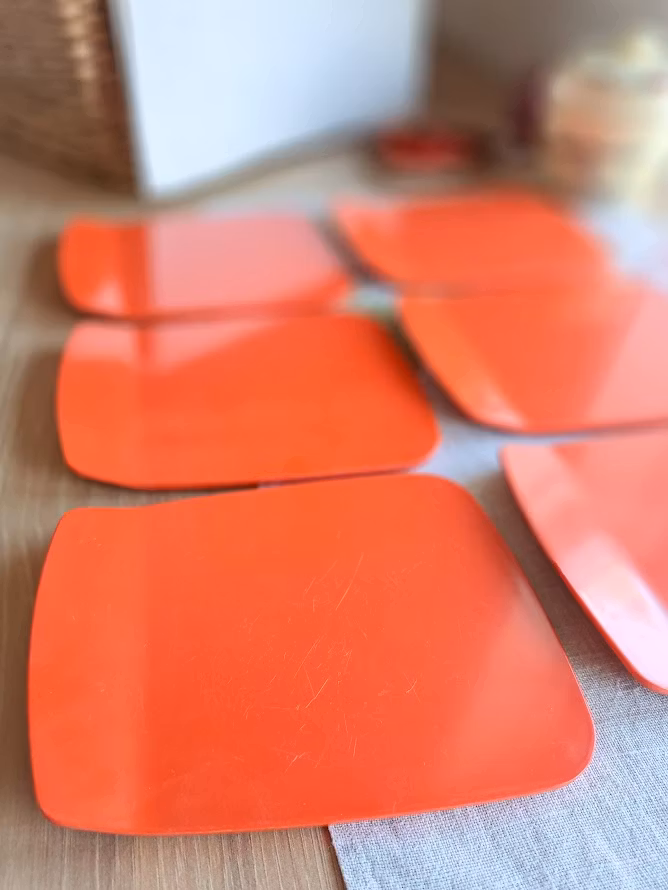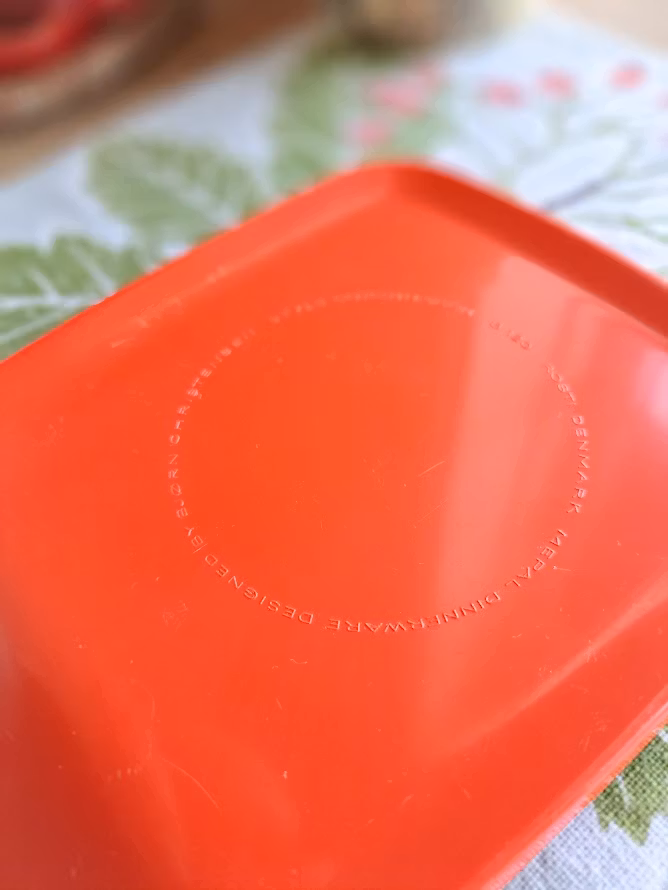 Äldre danska smörgåsbrickor. Formgiven av Bjørn Christensen för Rosti, troligtvis under 1960/1970-talet. Tillverkade i melaminplast. Levereras om 6 styck smörgåsbrickor. Bruksskick enligt bilder.