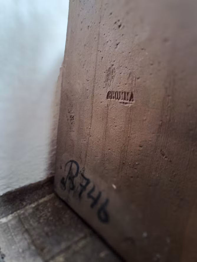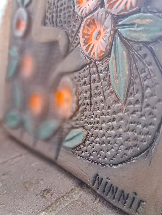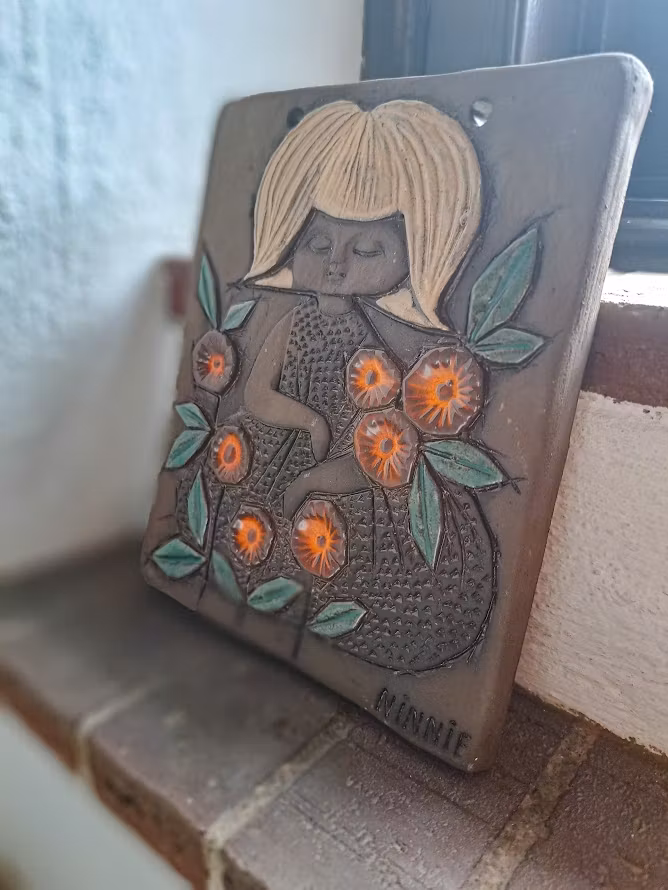Tavla i rustik stengodskeramik. Från 1960-talet av konstnären Ninnie Forsgren. 2 hål i keramiken för upphängning. I väl bevarat bruksskick.