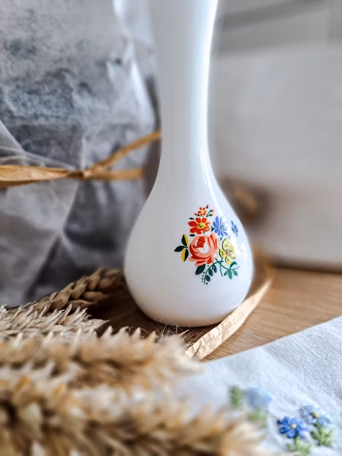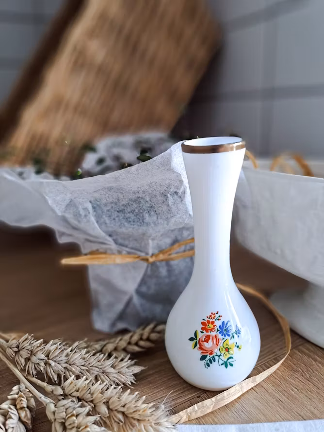 Blomsterprydd äldre vas i möjligtvis opalglas eller så kallat mjölkglas. Guldfärgad kant. Vasen saknar information om varumärke samt tillverkningsland. Bruksskick.