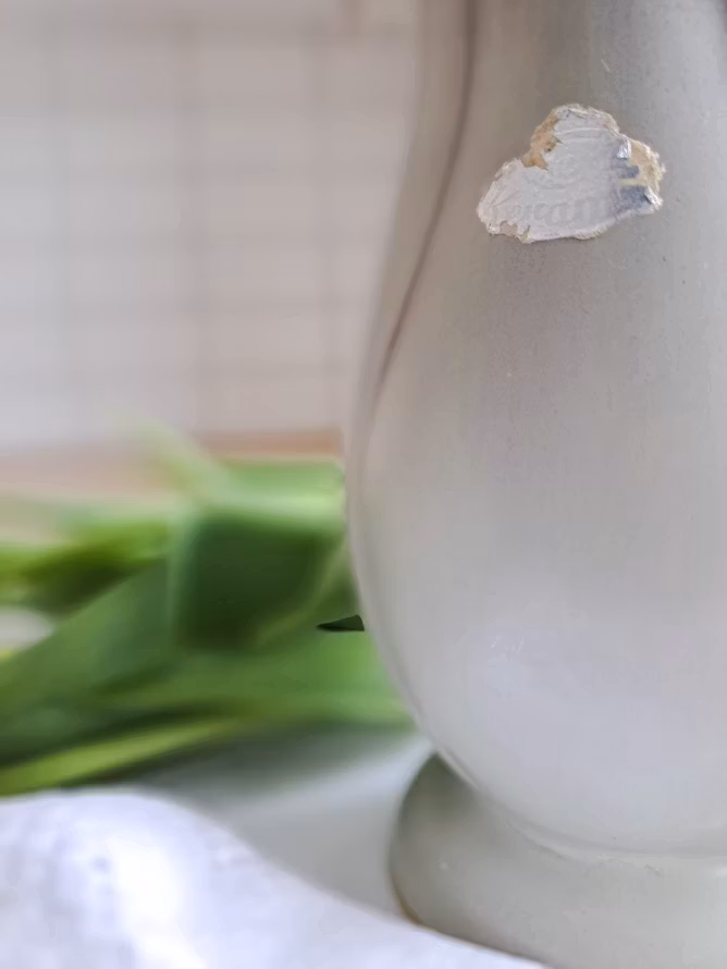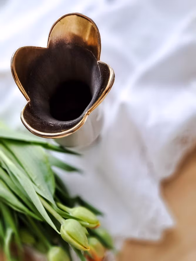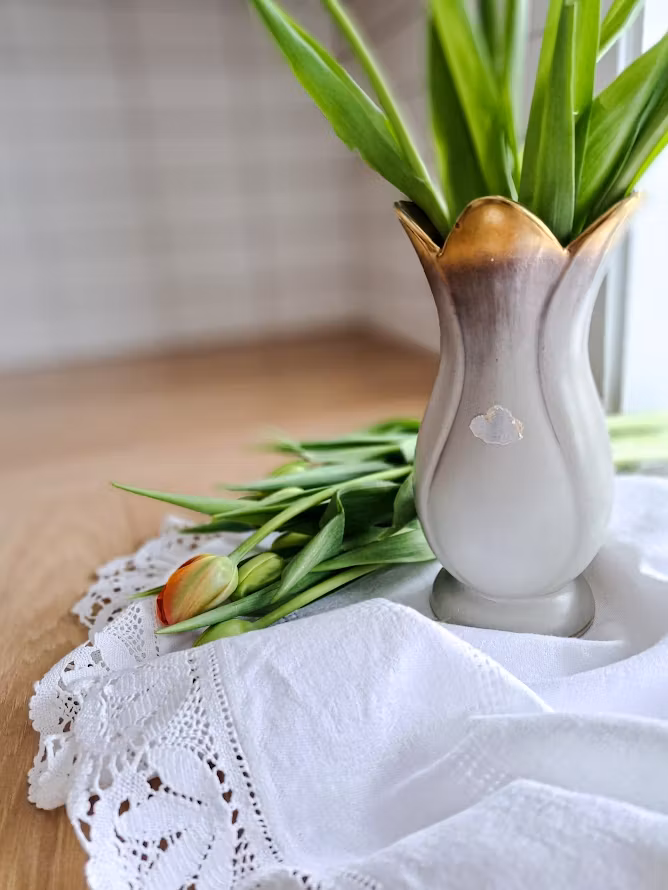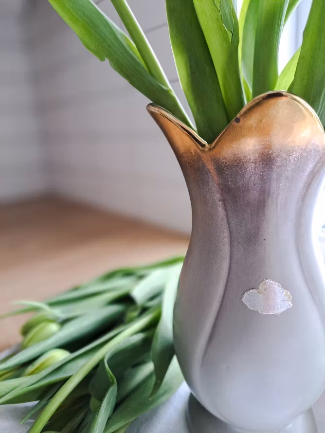 Äldre tulpanformad vas i mild grön ton och förgylld mynning. Troligtvis från 1950/1960-talet. Liten rand av kalkbeläggning på insidan av vasens hals, annars i mycket fint bevarat bruksskick.