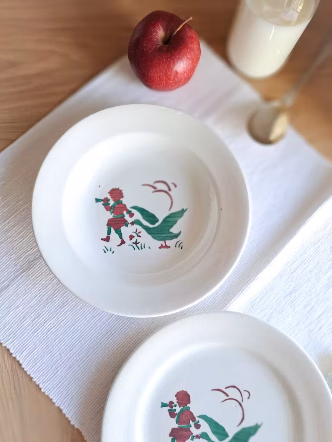 Äldre fint set till barn med tallrik och tillhörande skål i porslin. Setet är från åren mellan 1913-1925 (se fabriksstämpel). Levereras om 1 styck tallrik och 1 styck skål. I väl bevarat bruksskick.