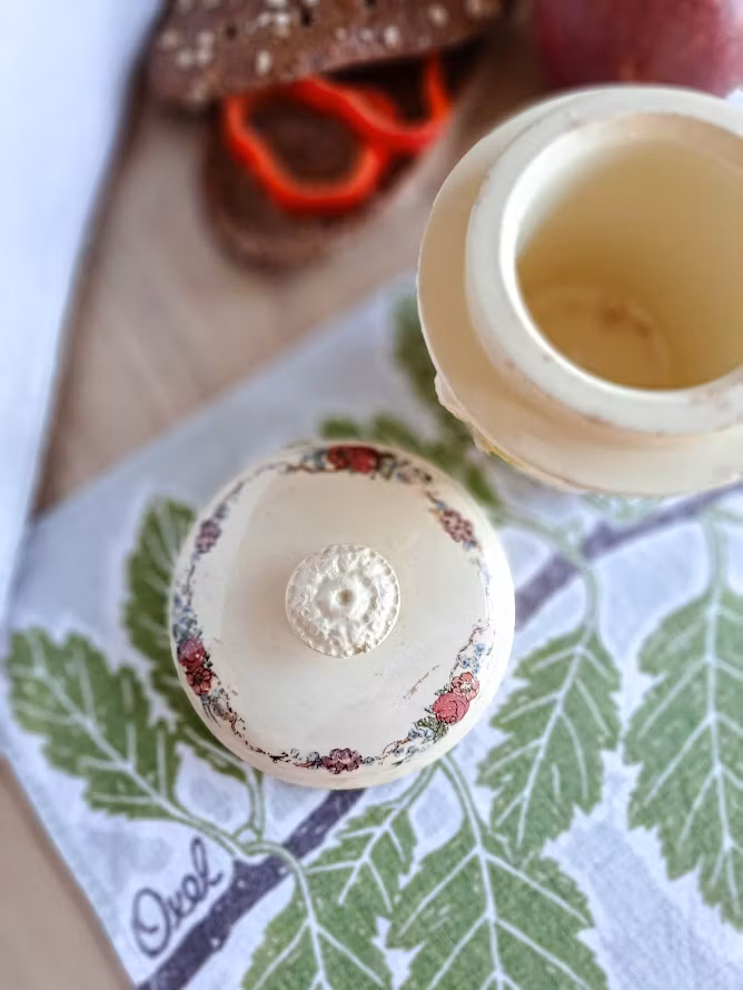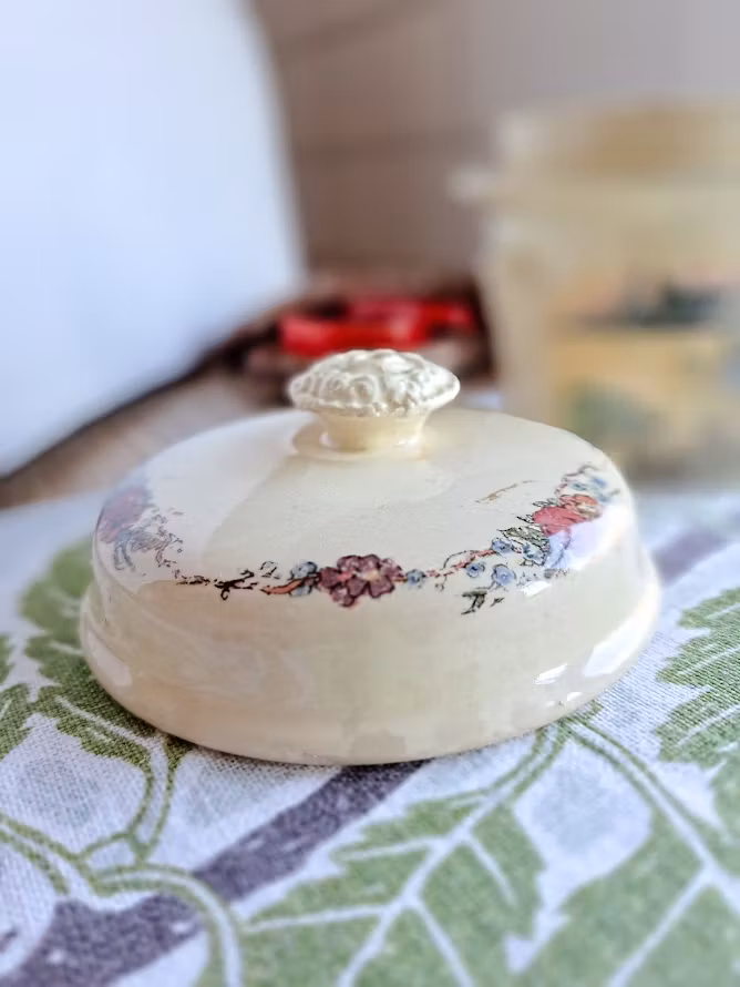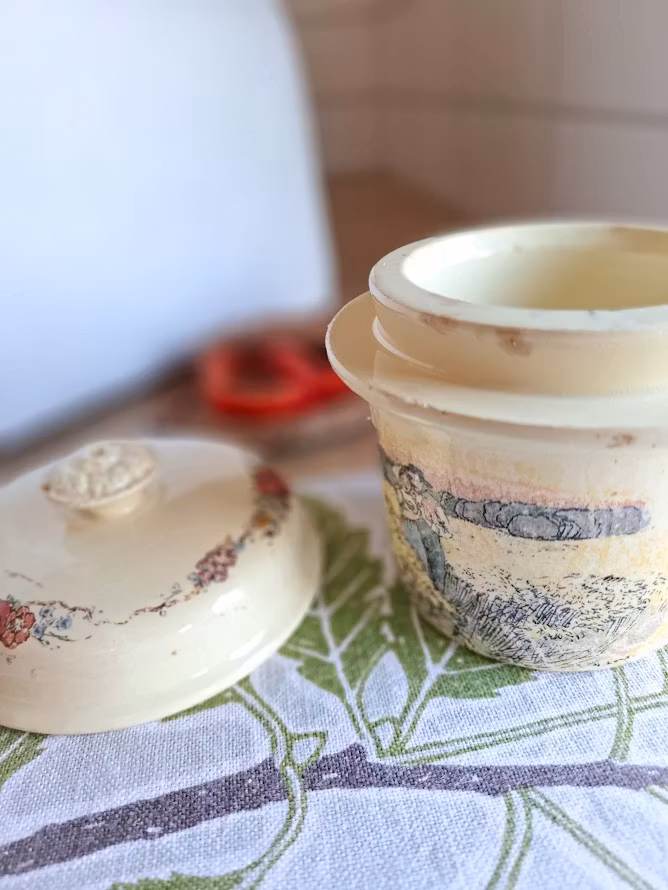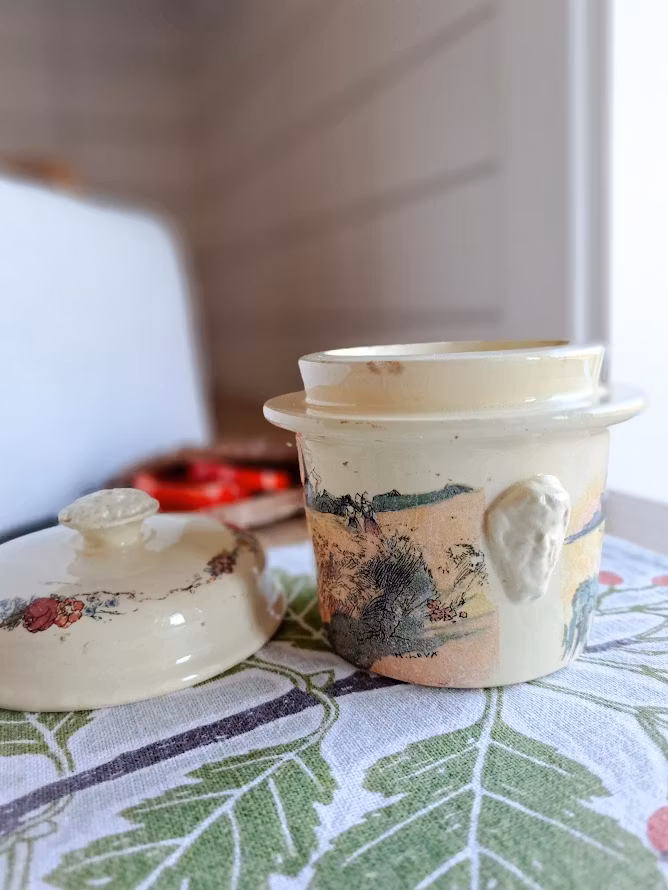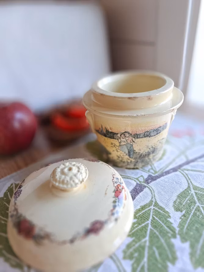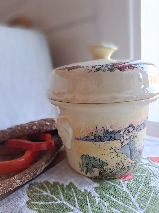 Äldre burk med lock i fajans, en typ av lergods. Detaljerade motiv av konstnären Henri Loux som skildrar det lantliga livet i Alsace, Frankrike. Bruksskick.