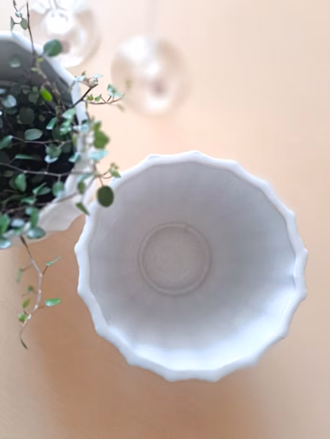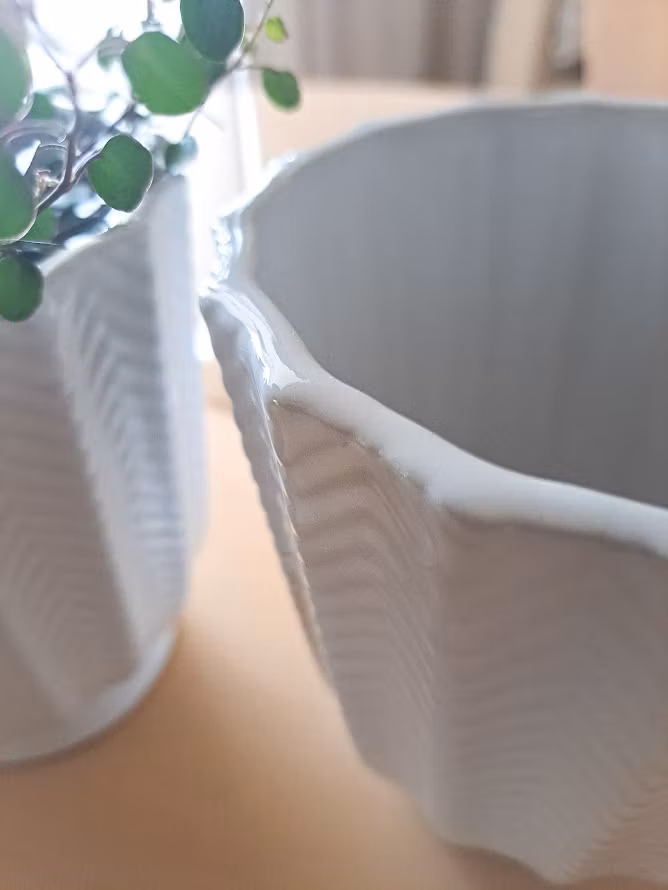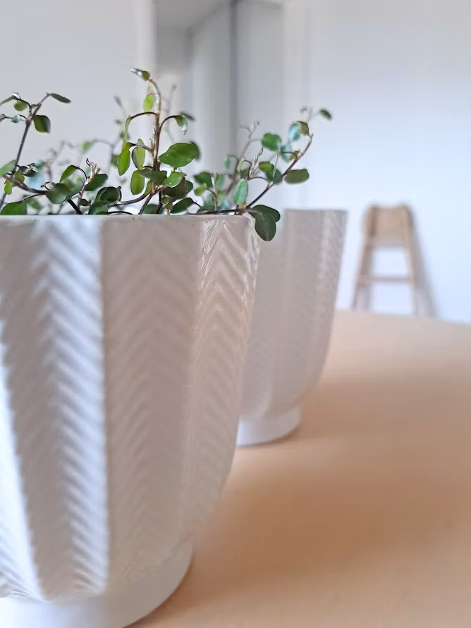 Krukor i vitt med tidlöst fiskbensmönster. Botten utan avrinning. Ingen information om tillverkare eller ålder. Levereras om 2 styck krukor. I mycket väl bevarat bruksskick.