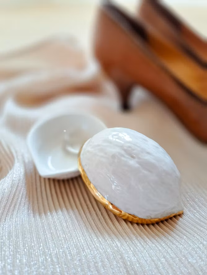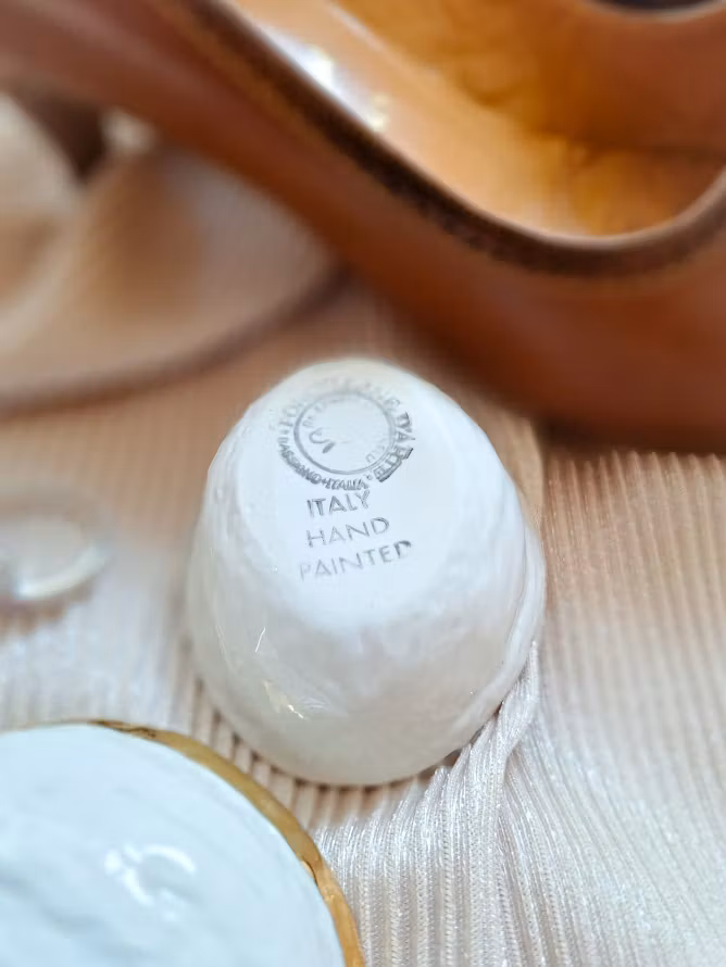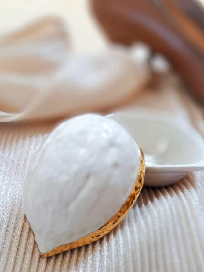 Italiensk porslinsask från 1970-talet, formad som en valnöt. Fin handmålad rand i guldfärg. I väl bevarat bruksskick.