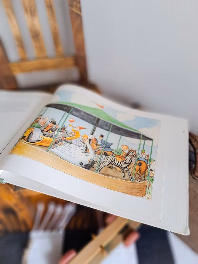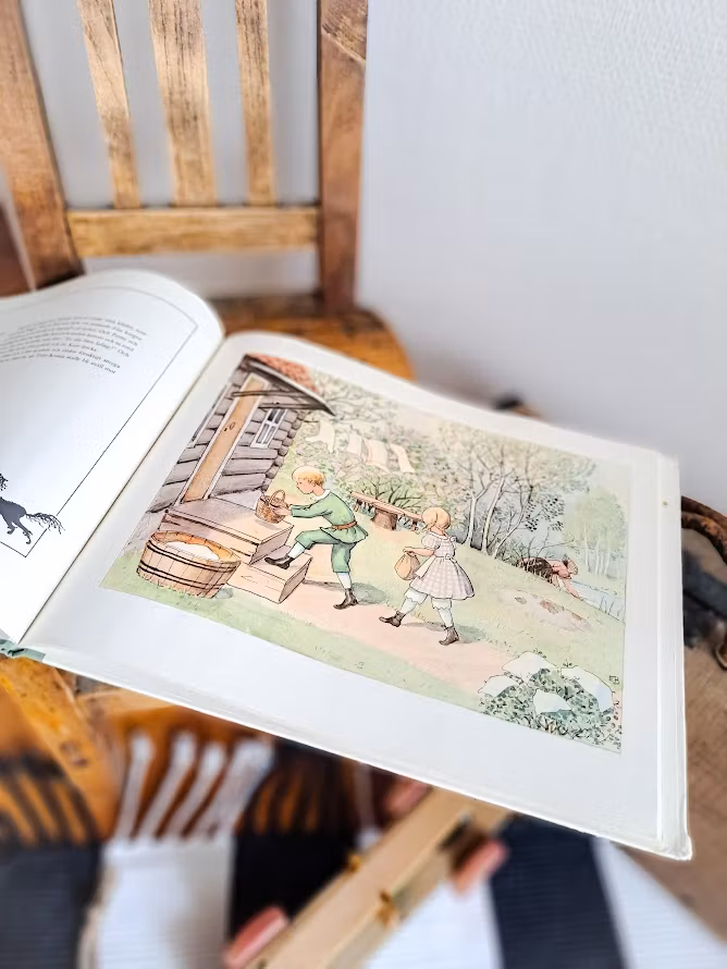 Äldre klassisk bilderbok av Elsa Beskow. Inbunden och vackert illustrerad bok i färg. Utkom första gången år 1929, denna utgåva är tryckt år 1975. I boken får man följa Petter och Lotta när Tant Grön, Tant Brun, Tant Gredelin och Farbror Blå ska åka på marknad. De båda barnen får inte följa med, men lyckas ändå hamna i ett riktigt spännande äventyr. Bruksskick.