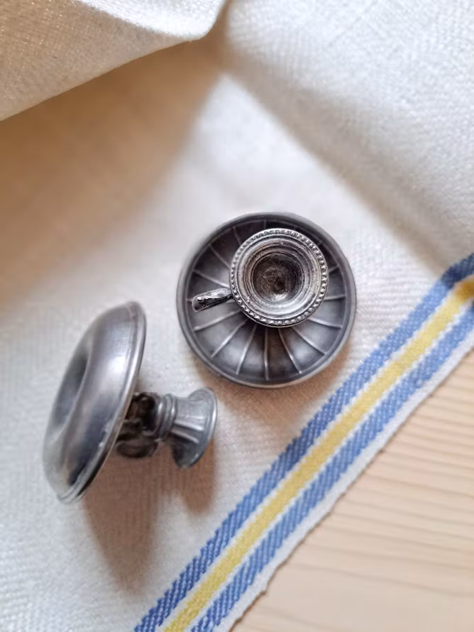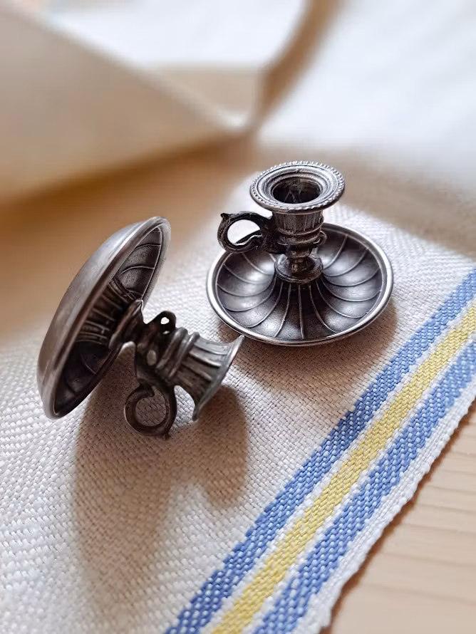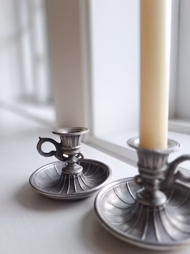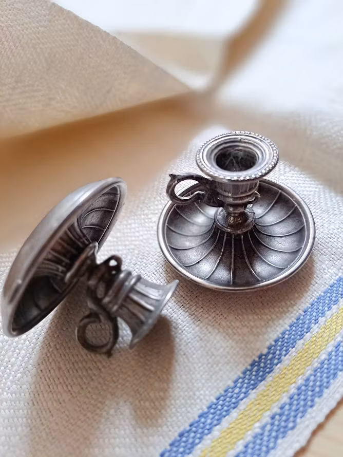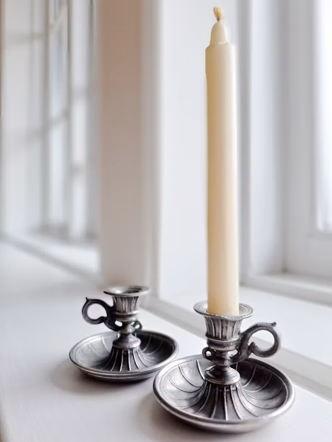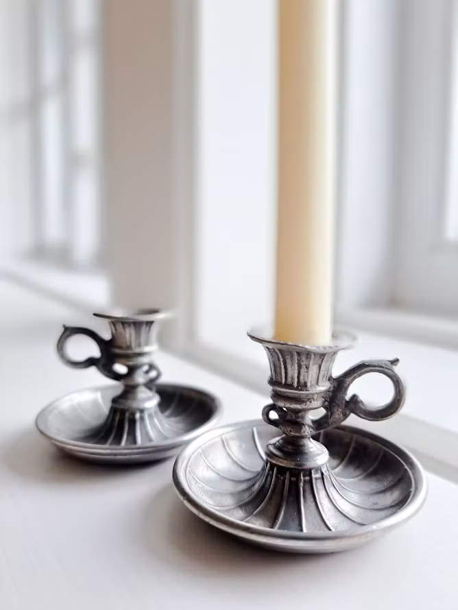 Dekorativa tennljusstakar i miniatyr, troligtvis från B.O Santesson Tenngjuteri. Från tiden runt år 1950. Levereras om 2 styck ljusstakar. Bruksskick.