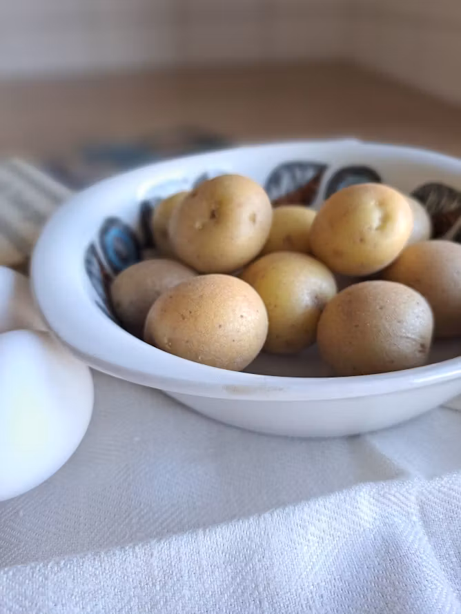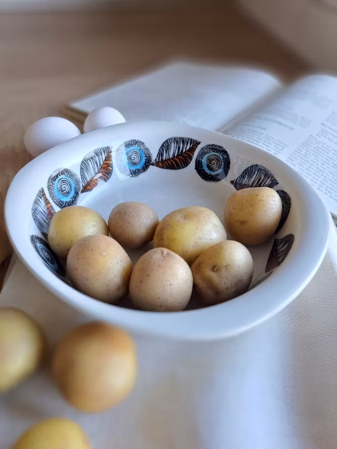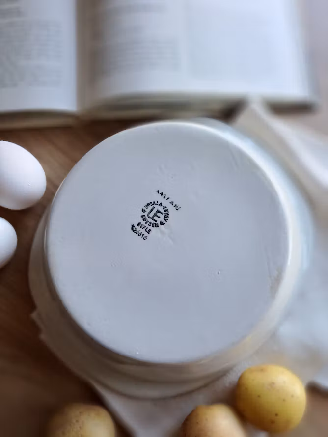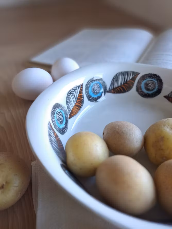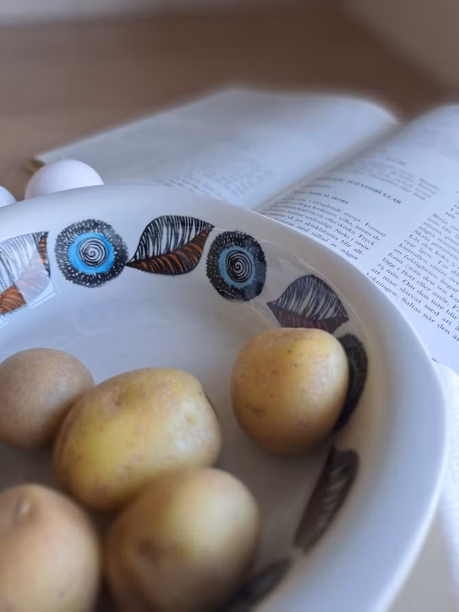 Äldre uppläggningsfat lämpligt för servering. Bård med stiliserat mönster. Troligtvis från 1960-talet. I väl bevarat bruksskick.