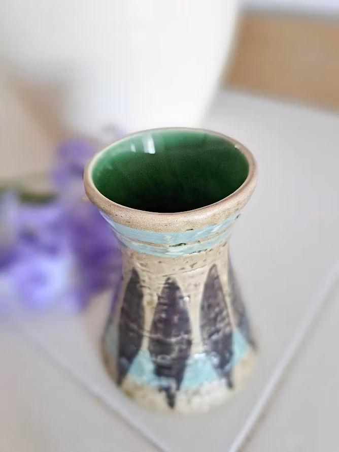 Rustik vas av keramikern Bruno Karlsson. Stengods som delvis har glaserats. Troligtvis från 1960-talet. I fint bevarat bruksskick.