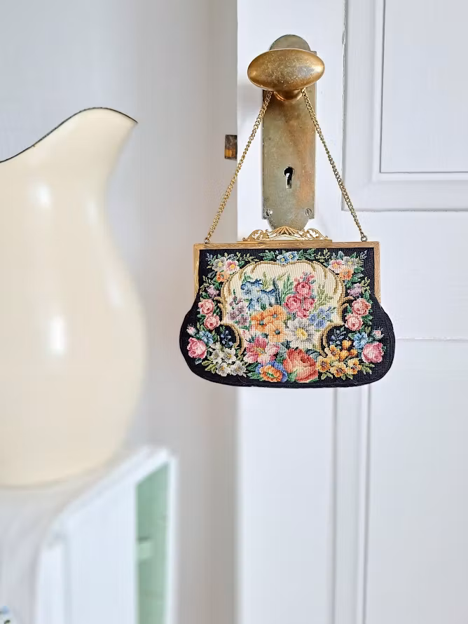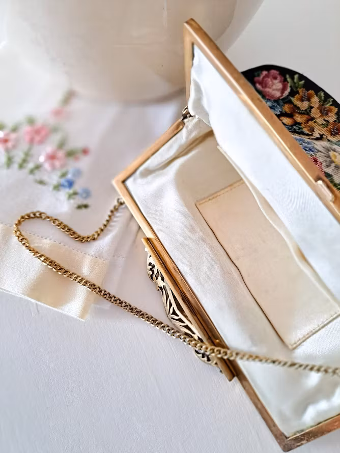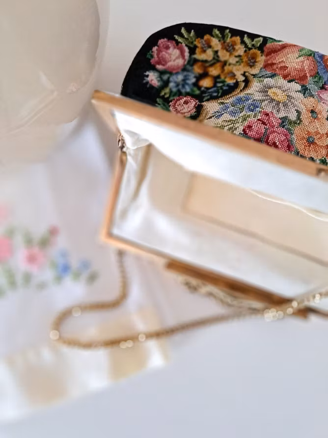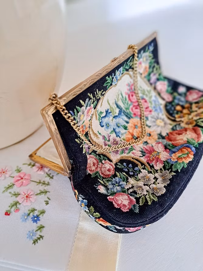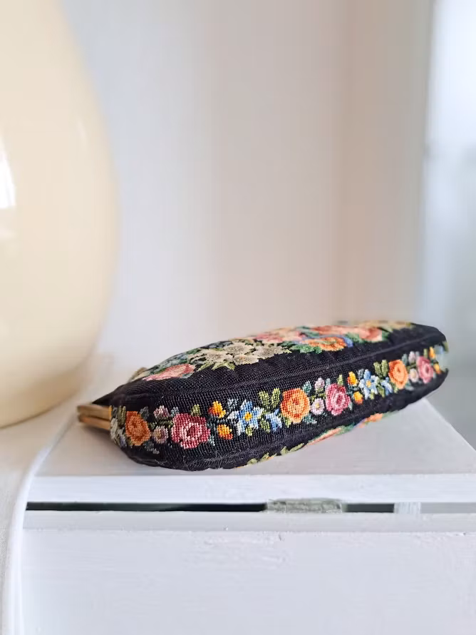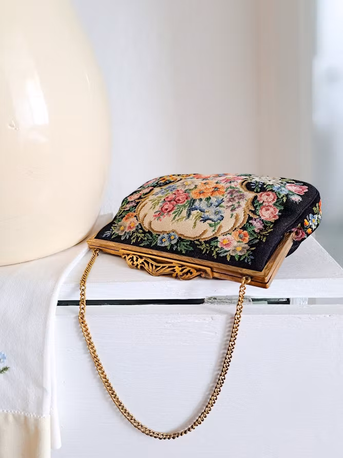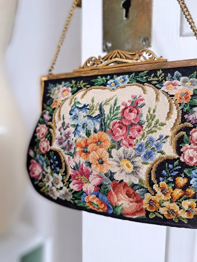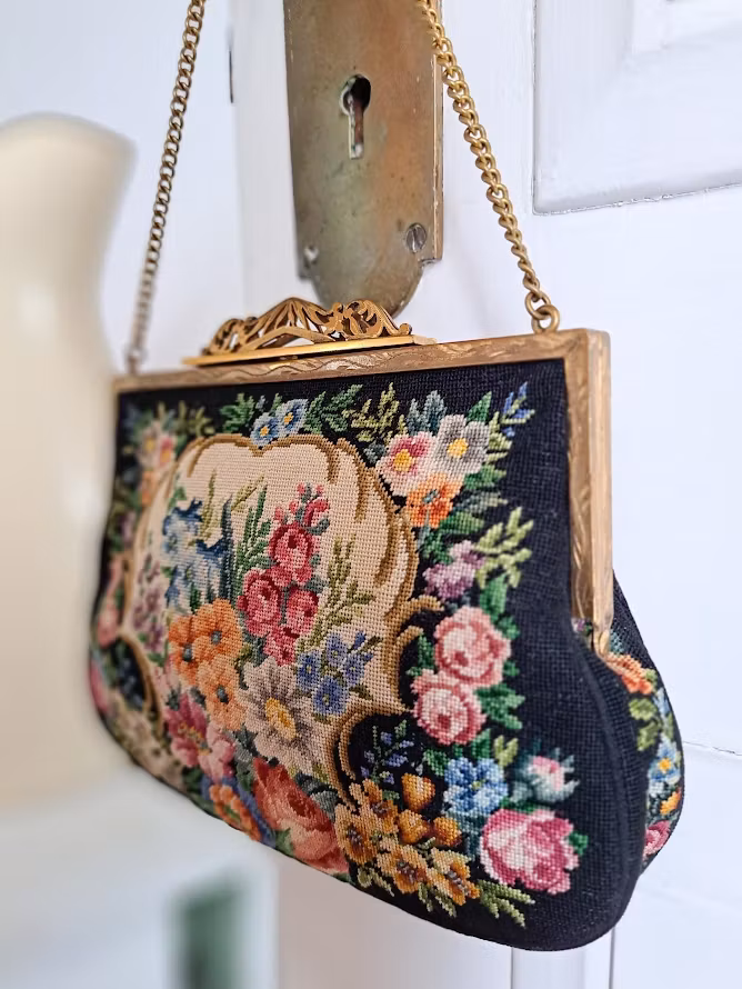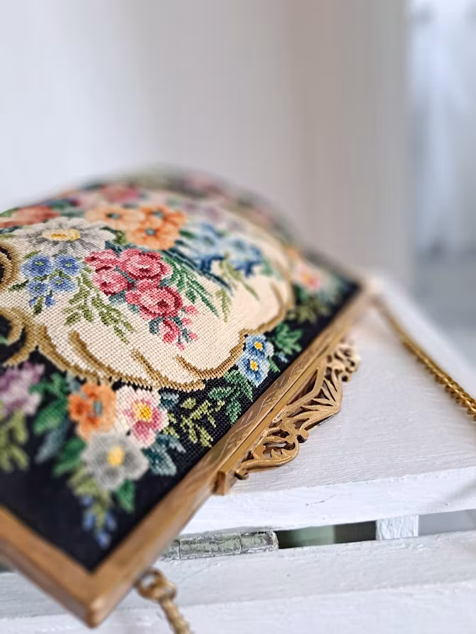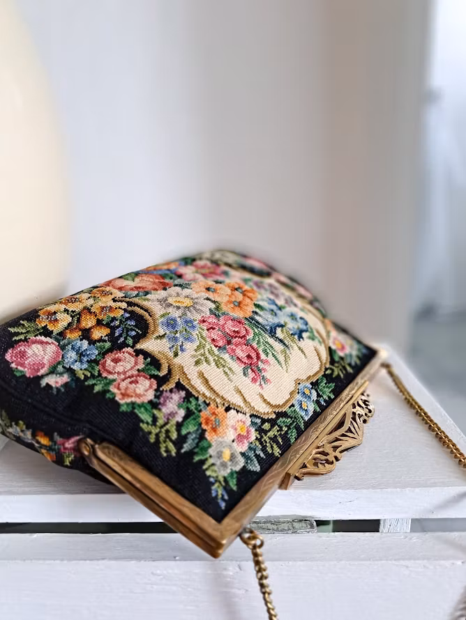 Äldre väska med mycket vackert Petit Pointbroderi (små korsstygn) på svart botten med en guldfärgad metallram. Kedja för upphängning och dekorativ förslutning. Insida fodrad. Väskan är troligtvis från 1950-talet. I fint bevarat bruksskick med smärre skönhetsfläckar i foder enligt bilder.