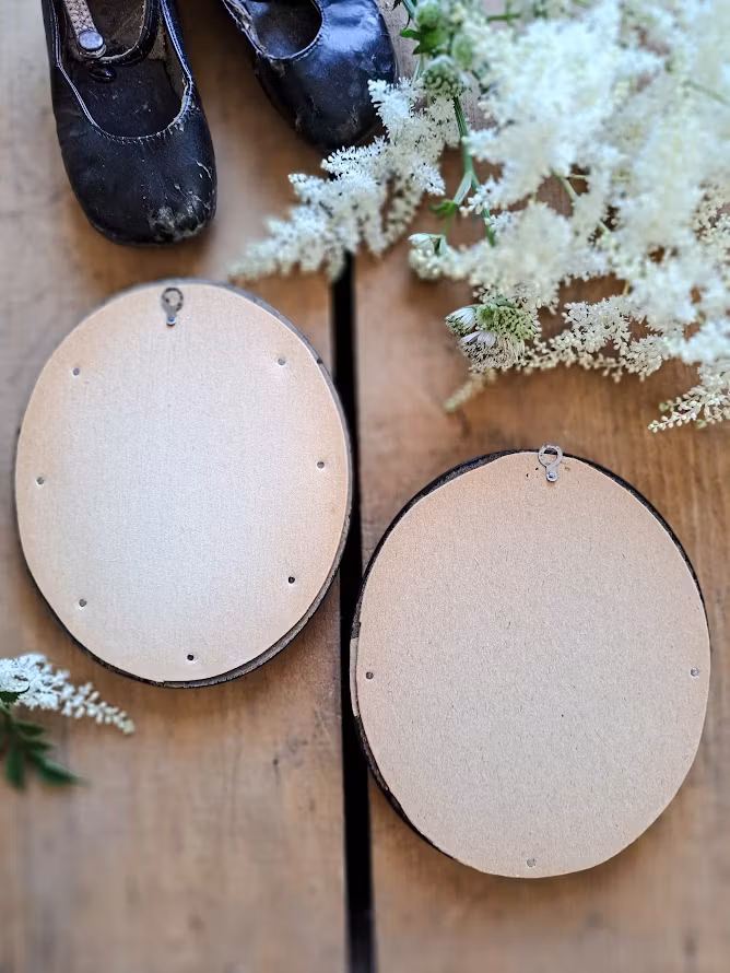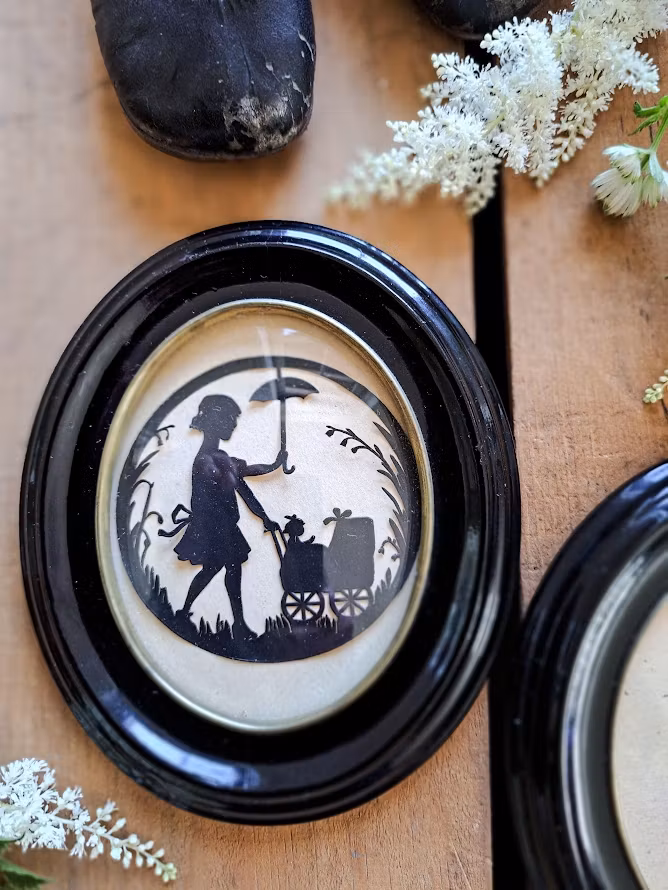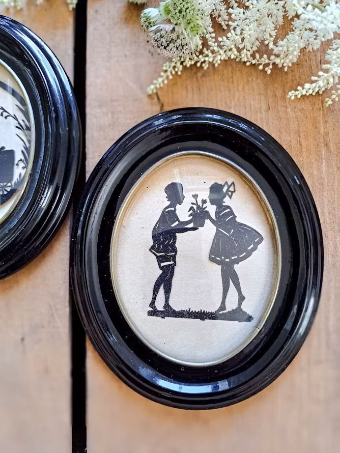 Äldre klippta siluetter i svarta ramar med kupat glas. Detaljrika. Möjlighet för upphängning finns. Levereras om 2 styck tavlor.