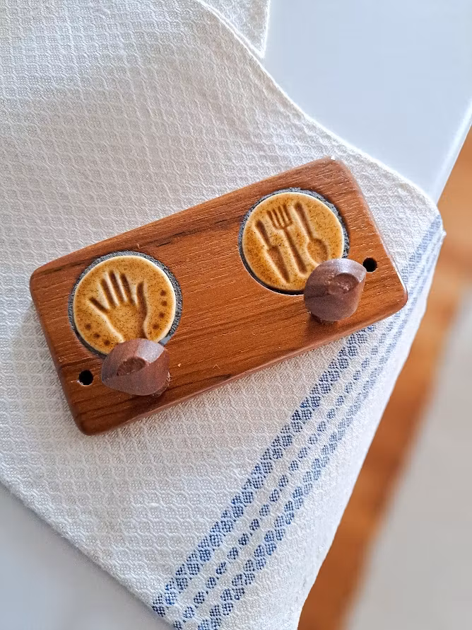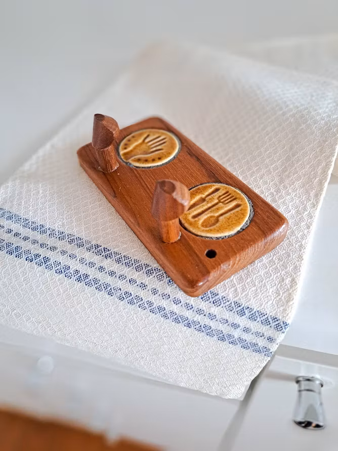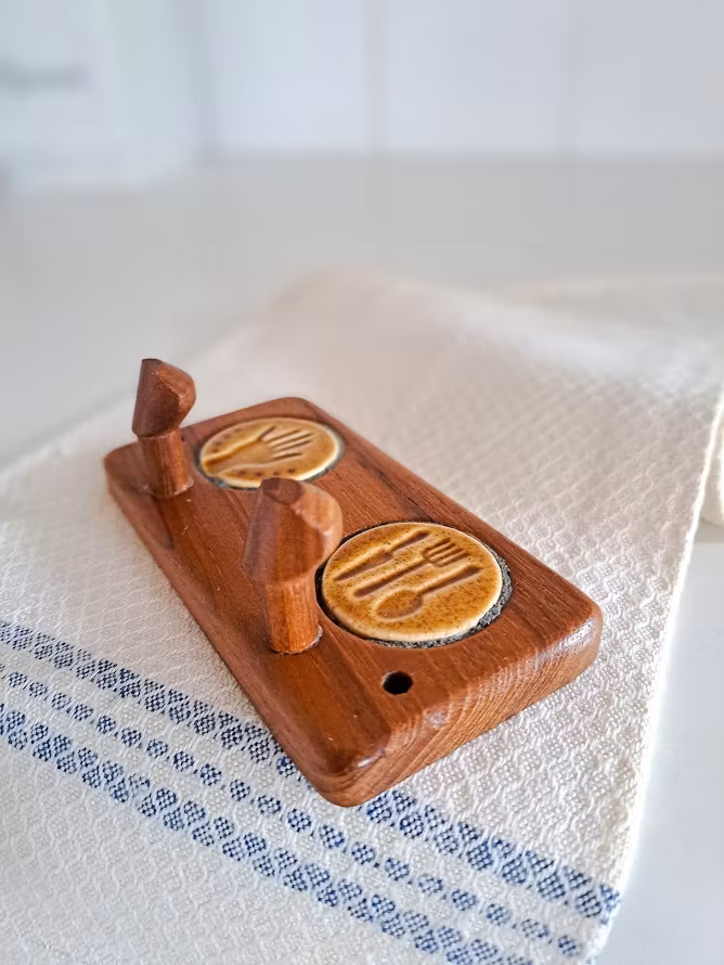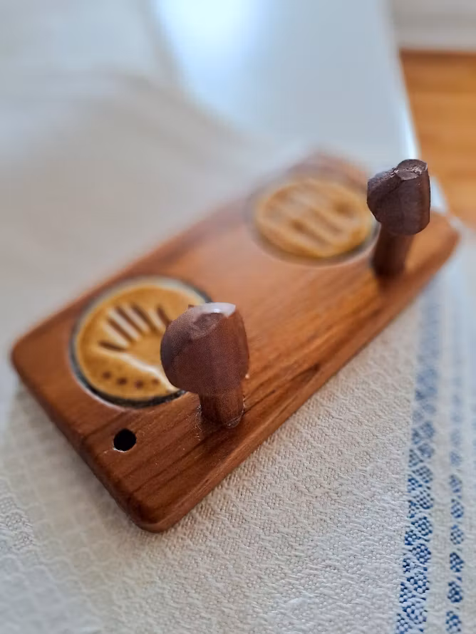 Äldre väggkrokar på list i teak med detaljer i keramik. Troligtvis från AB Johansson & Küller eftr. 2 hål för upphängning. I väl bevarat bruksskick.