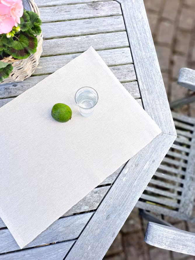 Ribbad tablett i ecru/sand. Textil tillverkad av 99% återvunnet material. Material som blivit över från andra textilproduktioner blir ny produkt av det som annars slängs bort. Därmed sparas upp till 50% vatten och 30% energi. Ej omfärgning eller tillsatta kemikalier. Tvättas i 40 grader.