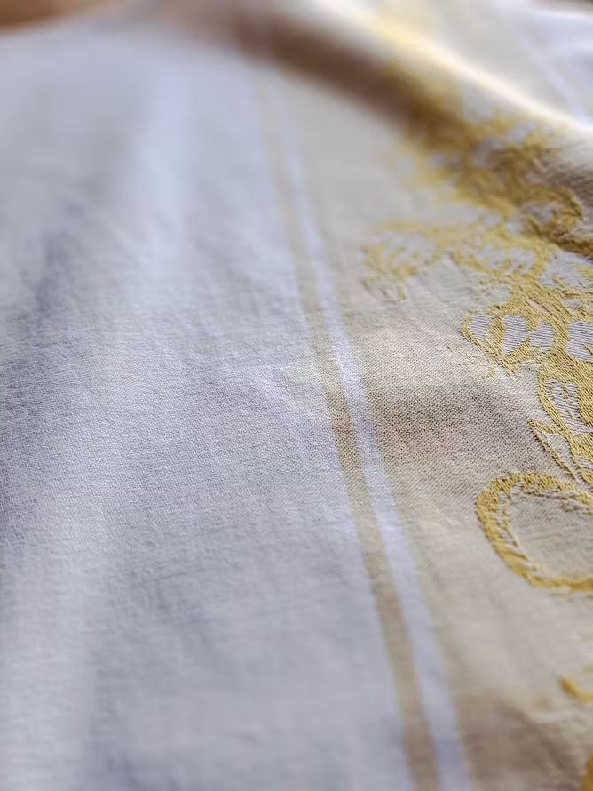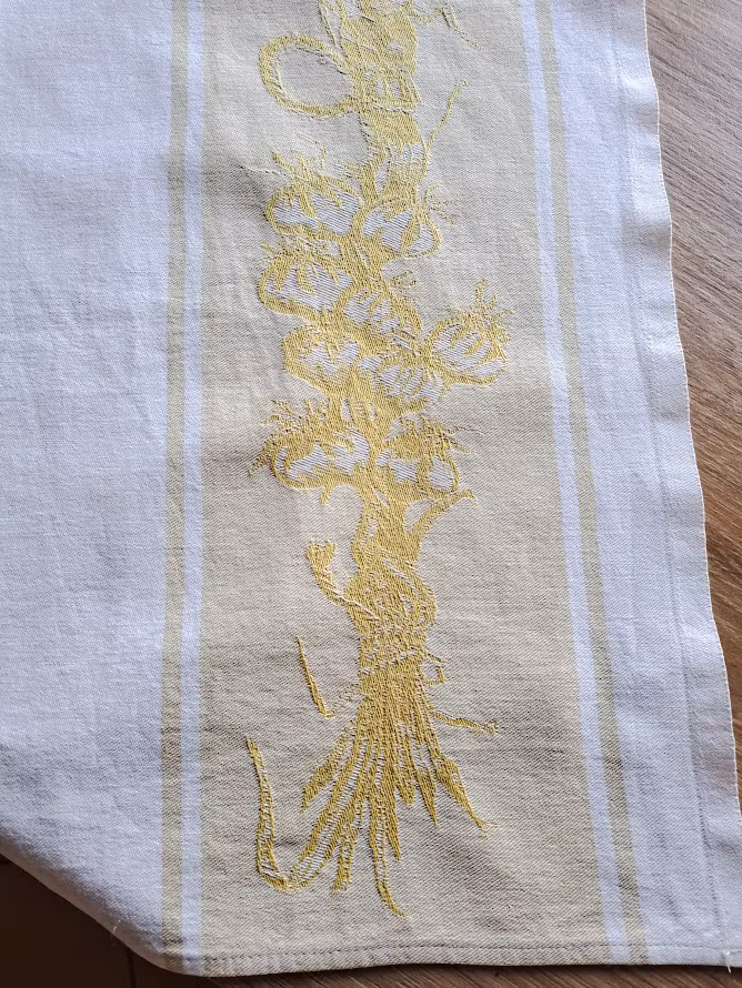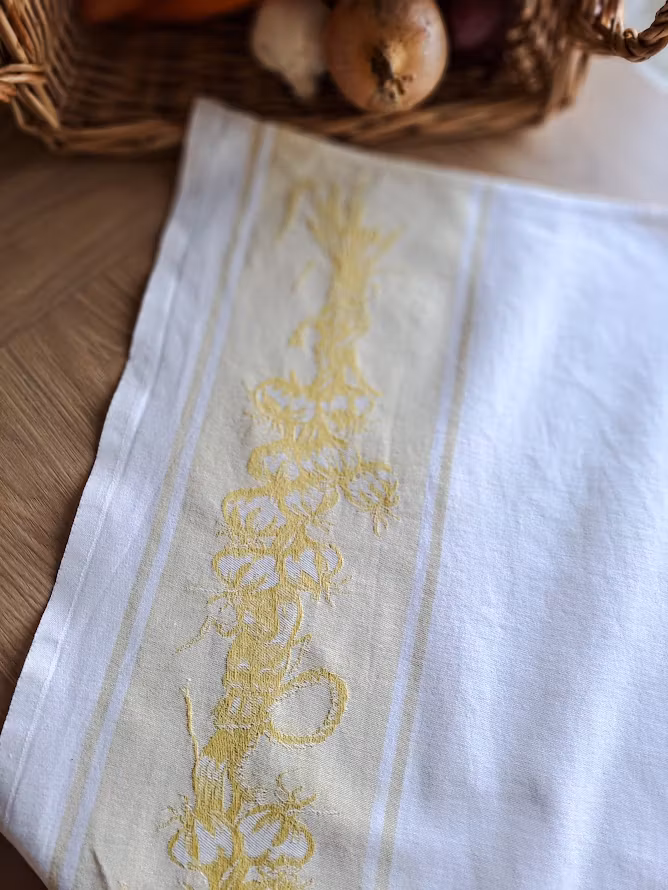 Kökshandduk från franska Claude Gerardmer dekorerad med hängande lökknippen i gult på vit botten. Med hank. Smärre fläckar i den vävda textiliern.